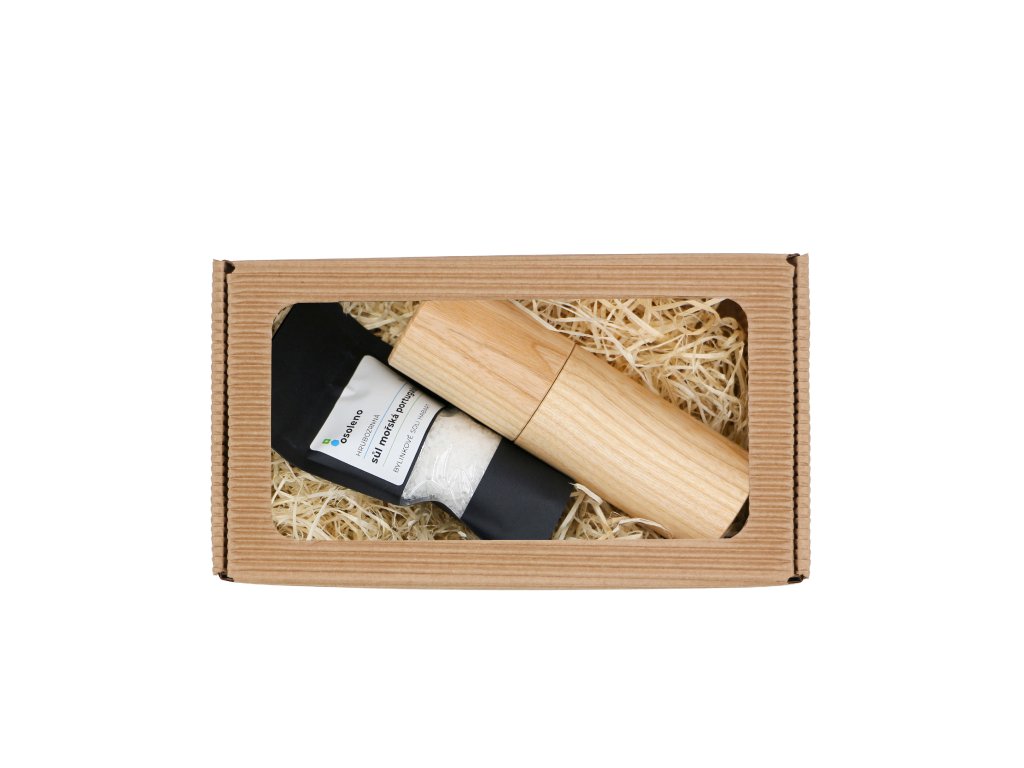 Balíček obsahuje luxusní dřevěný mlýnek 15 cm a hrubozrnnou portugalskou mořskou sůl (50g).
